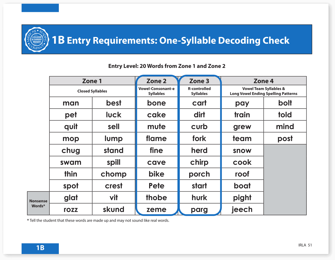Student A is unable to decode greater than 70% of the words in the 1B column. The student specifically struggles with VCe words.